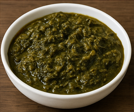 Plat emblématique à base de feuilles de manioc finement pilées et mijotées pendant des heures.